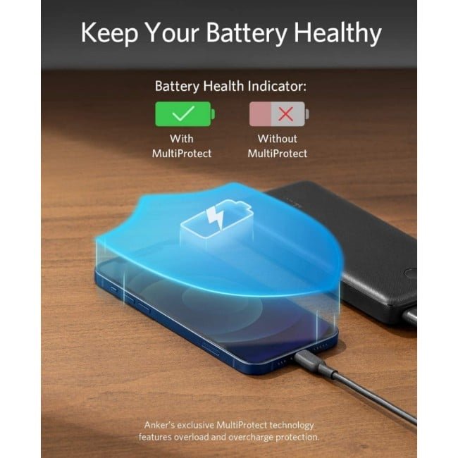 Recharge PowerCore using either the micro USB or USB-C ports. Micro USB cable included. USB-C cable not included. The USB-C port is input-only and cannot charge other devices.