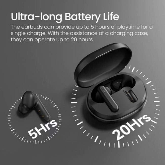 The Haylou GT7 Neo earbuds can operate up to 6.5 hours for a single full charge. With the assistance of a charging case, the total battery life can be up to 22 hours.