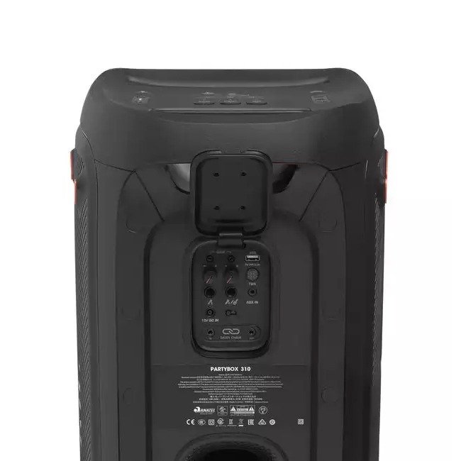 Huge sound, dazzling lights and unbelievable power set this speaker apart from the crowd. The JBL PartyBox 310 packs a full party into a transportable, splashproof sound machine like no other. Turn up your favorite playlists anywhere, from get-togethers at home to dance parties on the beach. Bring big party vibes with 240 watts of JBL Pro Sound and a synced light show that grooves to the beat. Plug in and keep the fun going all night or wheel over to the campfire and take advantage of its impressive 18-hour battery life. Start a party with the JBL PartyBox 310.