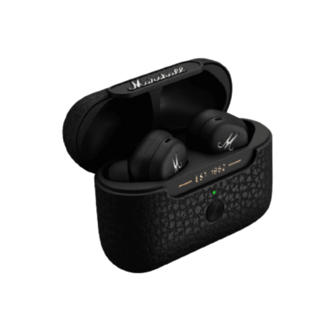 You should never have to go down in sound when you go down in size. Motif A.N.C. delivers the same Marshall sound in a design that is both sturdy and slim. These headphones are the definition of rugged, with IPX5-rated earbuds and an IPX4-rated scratch-proof pocket-sized charging case, so you can carry it around with you and keep the music going.