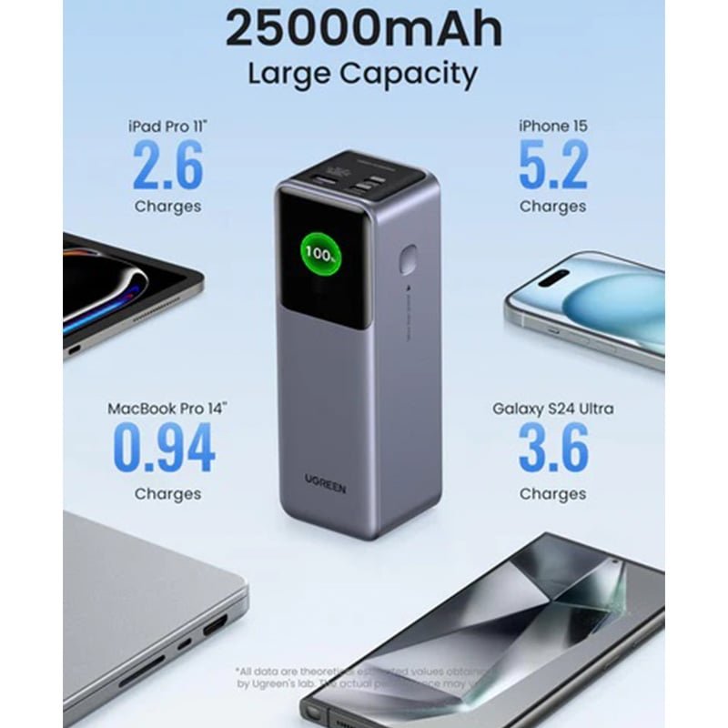 Massive 25,000mAh Capacity: UGREEN 25000mAh power bank provides a continuous and reliable power supply, fully charging MacBook Pro 16″ up to 1.3 times, iPhone 15 up to 5.2 times and Galaxy S23 Ultra up to 3.6 times. 90Wh airline-approved capacity is ideal for carry-on, keeping your global travel full of energy.