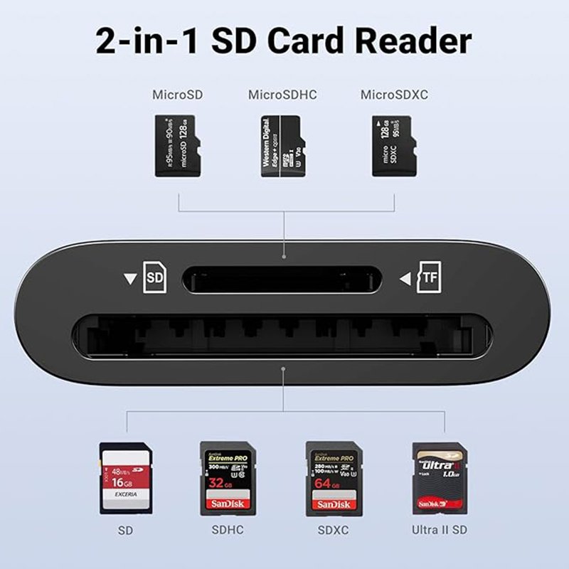 Read 2 Cards Simultaneously: Simultaneously read and write on 2 external memory cards (SD/Micro SD) to save the constant plugging and pulling of plugs, Support UHS-I SD, SDHC, SDXC, Micro SD, Micro SDHC, Micro SDXC, and MMC RS-MMC cards. Note: This SD card adapter supports UHS-II SD/TF cards, but the speed will be UHS-I.