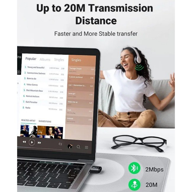 UGREEN Bluetooth 5.0 Bluetooth Adapter for PC can transmit 20 meters distance without delay.