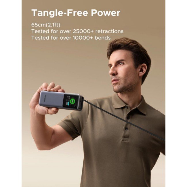 100W Retractable Cable:Â 70cm cable (25000+ uses). Charges 16″ MacBook Pro to 43% in 30min; recharges in 1.9h (with 100W+ charger)